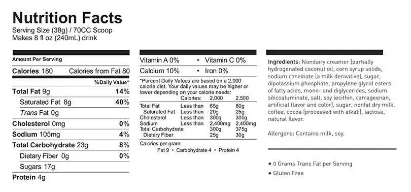 Manufactured for Cappuccine, Inc., Corona, CA 92880. Product manufactured in a facility that also handles egg, wheat and peanut. Nutrition facts and ingredients subject to change without notice. Products may vary by region and country, consult product label for actual contents. Grams per scoop is an average and may vary depending upon ambient conditions and product compaction from transportation and/ or storage.
